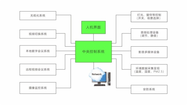系统包含可编程网络控制系统、投影(大屏)显示系统、视频传输及切换系统、会议发言系统、专业 音响系统、监控系统、环境监测系统等。