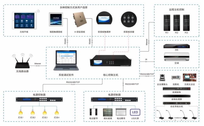 控制系统能够根据用户的应用需求,适时控制各设备的开关,功能的切换,联动相关设备动作与应用 场景进行智能,协调工作,达到最佳的应用效果。