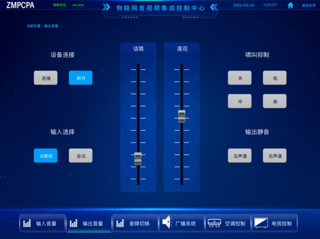 通过主机上的RS232口连接音频处理器,控制平板实时同步显示和控制当前通道输入输出音量;